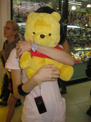 to catch soft toys through the UFO machine thing. I've always thought that it's a scam, so that they'll earn all your $1. But Jimmy proved me wrong. He caught two of these Pooh Bears, in 3 tries. Which means my Scrump is only $1, and Esther's Pooh Bear is $2! See...!